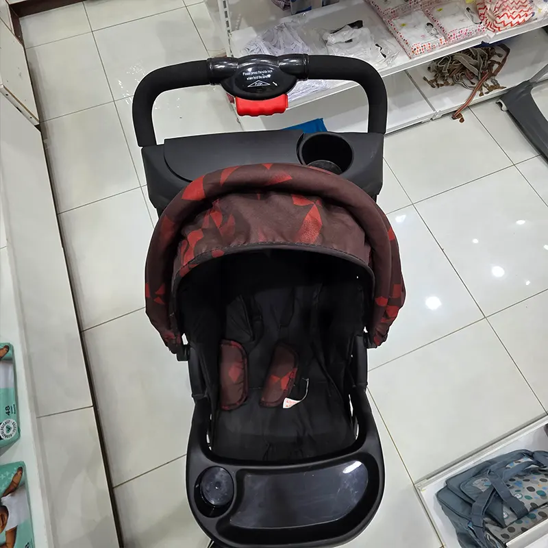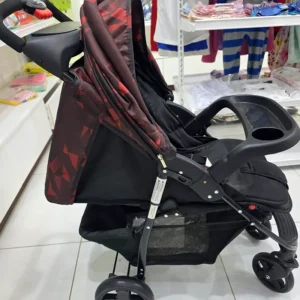 The stroller features an extendable canopy with a stylish red geometric design, protecting your baby from sun and wind. The front parent tray includes a cup holder, making it easy to keep your phone, bottle, or snacks close by. The spacious under-seat basket gives you enough room for diapers, wipes, shopping and essentials during walks.